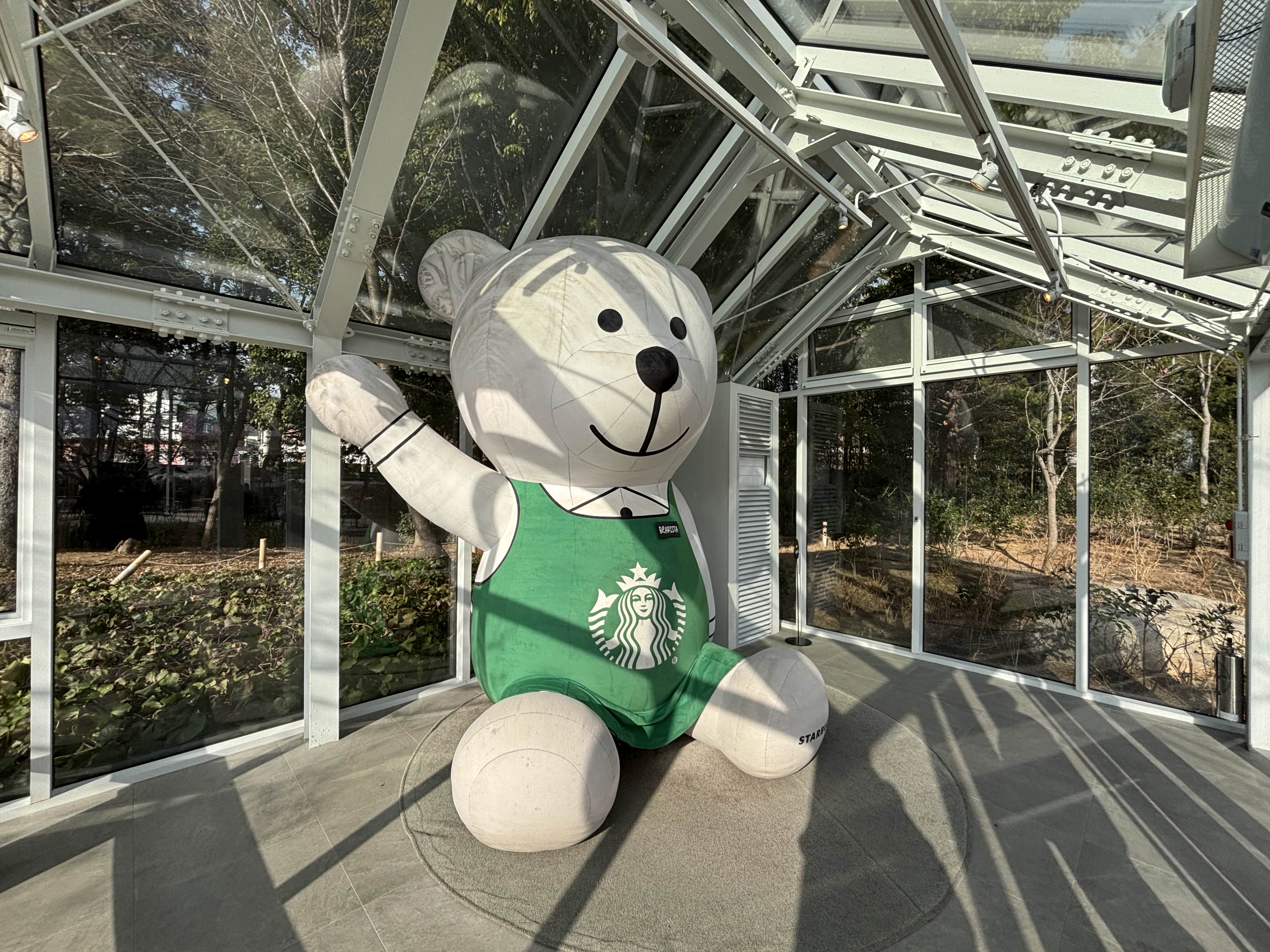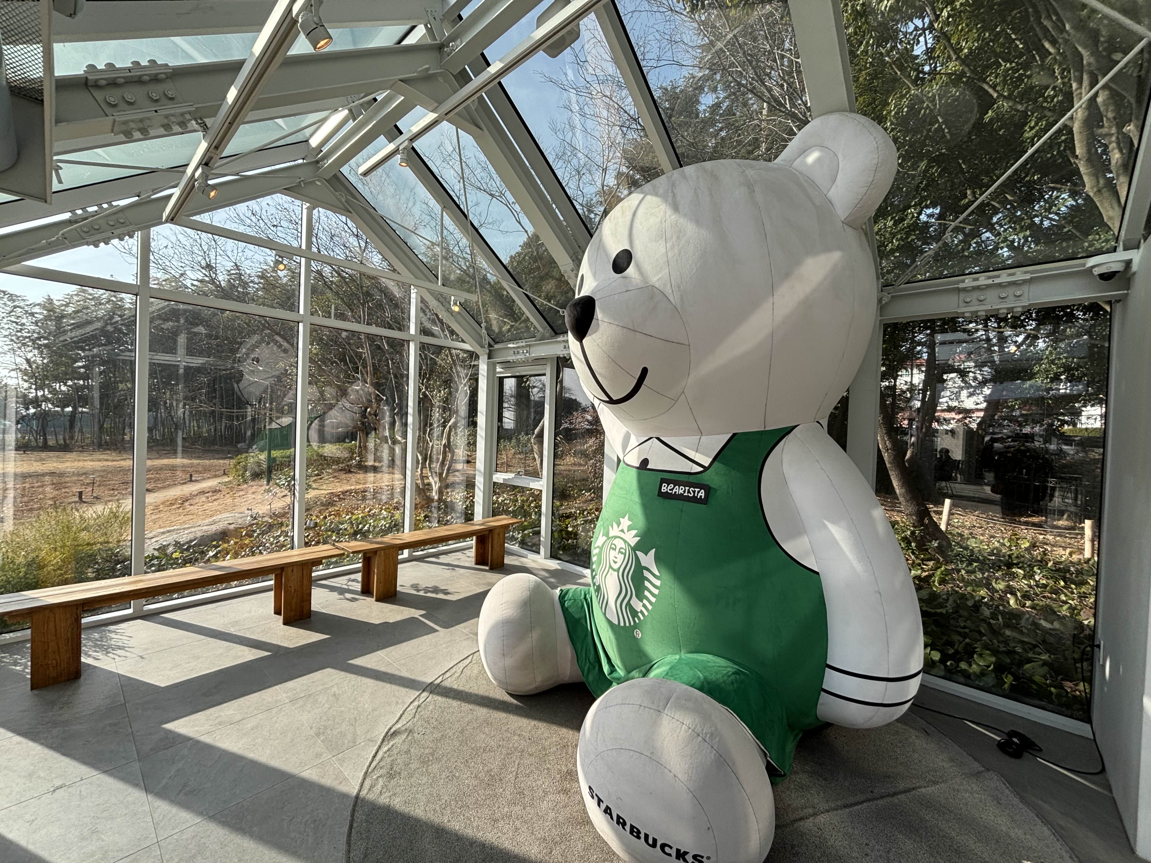 그리고 다른 또 하나의 매력은 바로 온실 속의 대형 바리스타 곰돌이 인형이에요! 이 귀여운 곰돌이 인형 앞에서 많은 사람들이 사진을 찍고 있어요. 📸🐻
